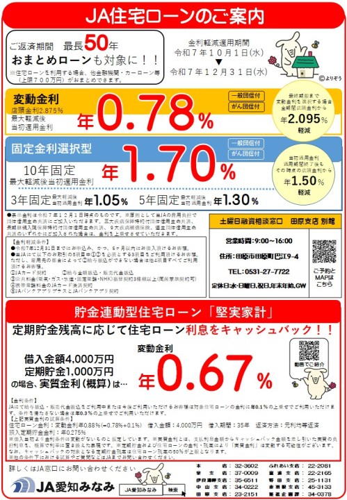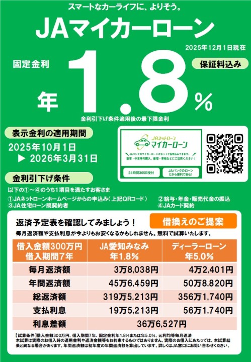 みなみinfo トップ みなみinfo ローン金利情報 2025年12月06日 JAバンク ローン金利情報 シェア Tweet 各ローン金利情報は以下よりご確認ください。 ○JA住宅ローン ○JAマイカーローン ○JA教育ローン JA住宅ローン R7.12現在 詳細はこちらから JAマイカーローン R7.12現在 詳細はこちらから JA教育ローン R7.12現在 詳しくは各金融支店窓口へお問い合わせください。 記事一覧はこちら