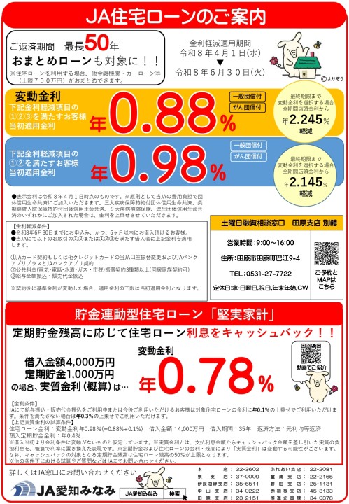 みなみinfo トップ みなみinfo ローン金利情報 2026年04月02日 JAバンク ローン金利情報 シェア Tweet 各ローン金利情報は以下よりご確認ください。 ○JA住宅ローン ○JAマイカーローン ○JA教育ローン JA住宅ローン R8.4現在 詳細はこちらから JAマイカーローン R8.4現在 詳細はこちらから JA教育ローン R8.3現在 詳しくは各金融支店窓口へお問い合わせください。 記事一覧はこちら