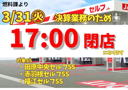みなみinfo トップ みなみinfo 決算に伴う営業時間短縮のお知らせ 2026年03月26日 みなみトピックス 決算に伴う営業時間短縮のお知らせ シェア Tweet 燃料課より 産直広場より 記事一覧はこちら