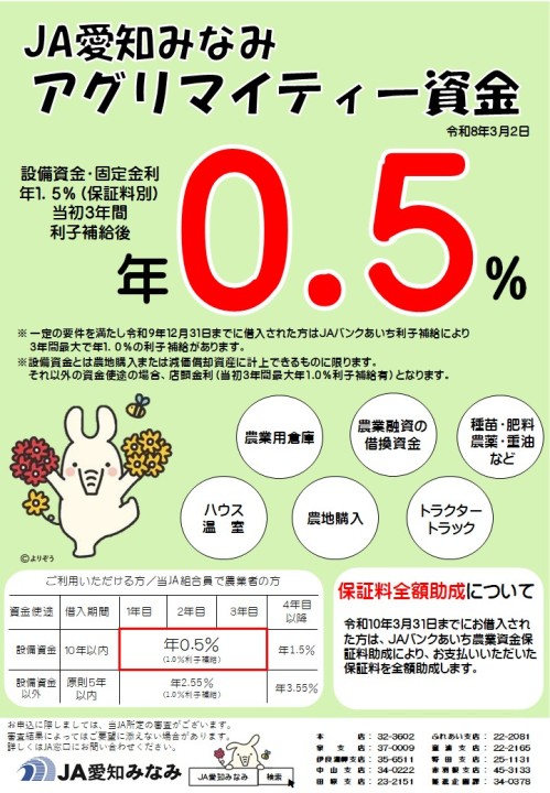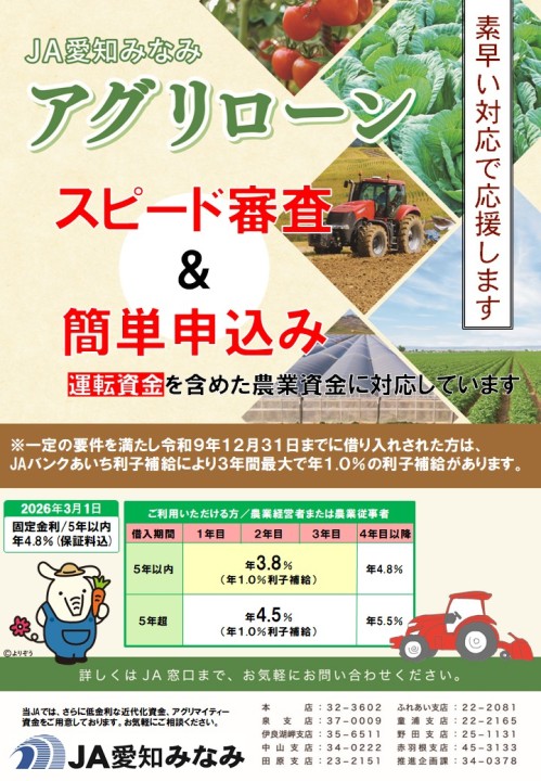 みなみinfo トップ みなみinfo 選べる2つの農業資金 2026年03月02日 JAバンク 選べる2つの農業資金 シェア Tweet 低金利をご希望の方はこちらがお勧め! ≫詳しくはこちら≪ 早さ簡単さをご希望の方はこちらがお勧め! ≫詳しくはこちら≪ 記事一覧はこちら