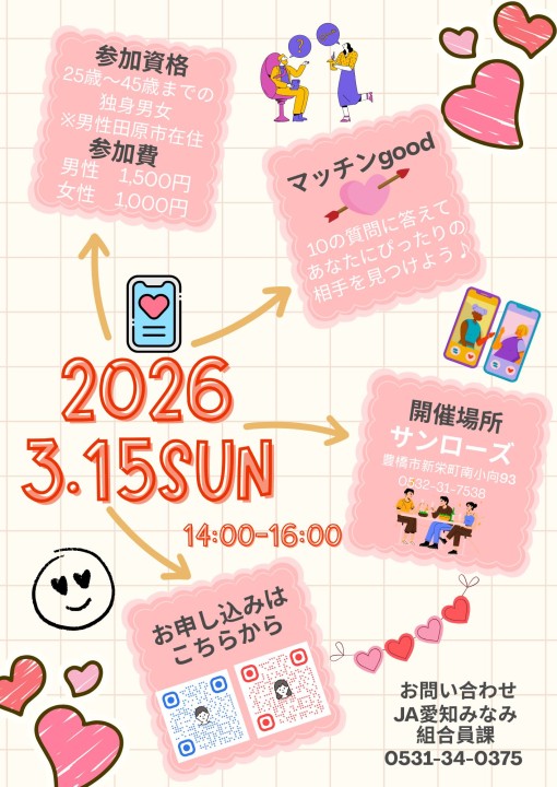 みなみinfo トップ みなみinfo 3/15婚活イベント『マッチンGOOD』開催! 2026年02月17日 みなみトピックス 3/15婚活イベント『マッチンGOOD』開催! シェア Tweet 応募はこちらから☆ 記事一覧はこちら