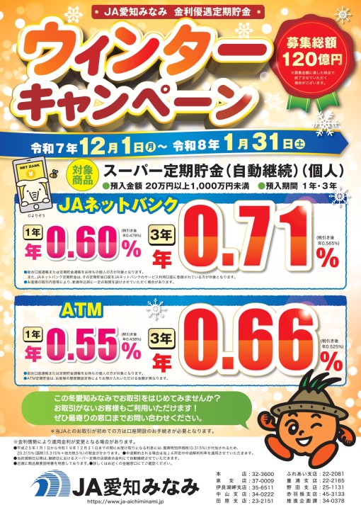 みなみinfo トップ みなみinfo 定期貯金ウィンターキャンペーン開催 2025年11月21日 JAバンク 定期貯金ウィンターキャンペーン開催 シェア Tweet JA愛知みなみ金利優遇定期貯金『ウィンターキャンペーン』が12月1日より始まります♪ 募集金額に達した時点で終了する可能性がありますので、お早めにご検討ください。 詳細はコチラ 記事一覧はこちら